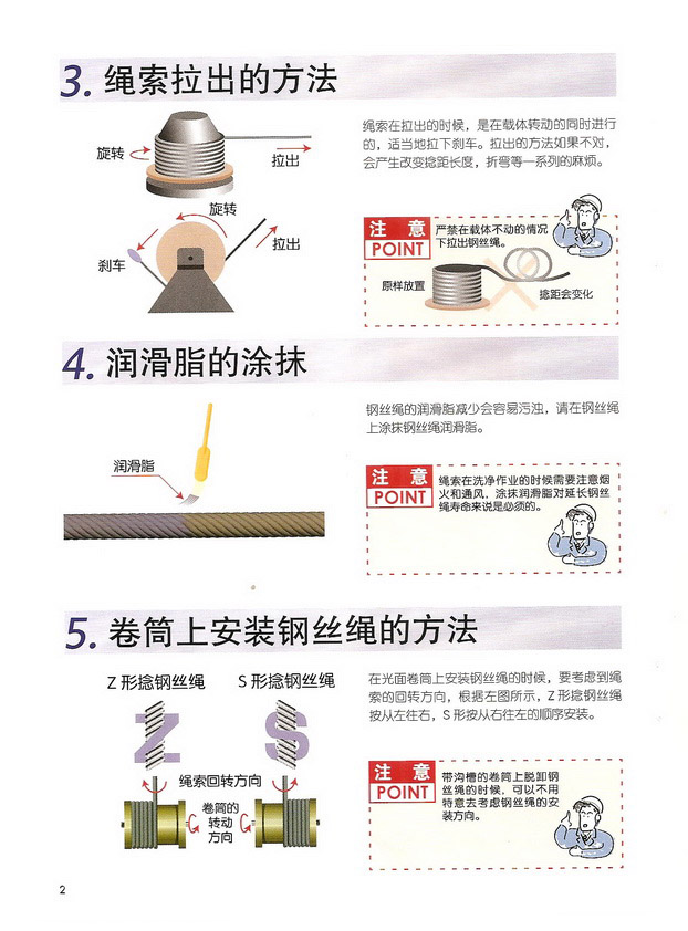 润滑脂的涂抹:钢丝绳的润滑脂减少会容易污浊,请在钢丝绳上涂抹钢丝绳润滑脂.注意:绳索在洗净作业的时候需要注意烟火和通风,涂抹润滑脂对延长钢丝绳寿命来说是必须的.
